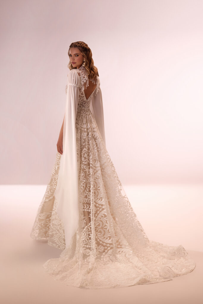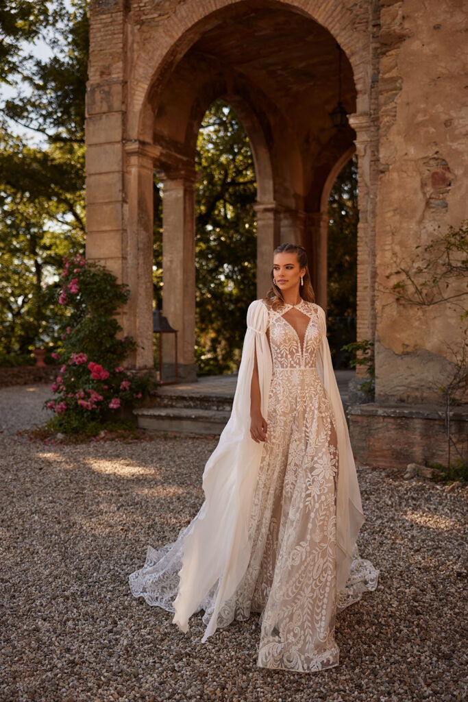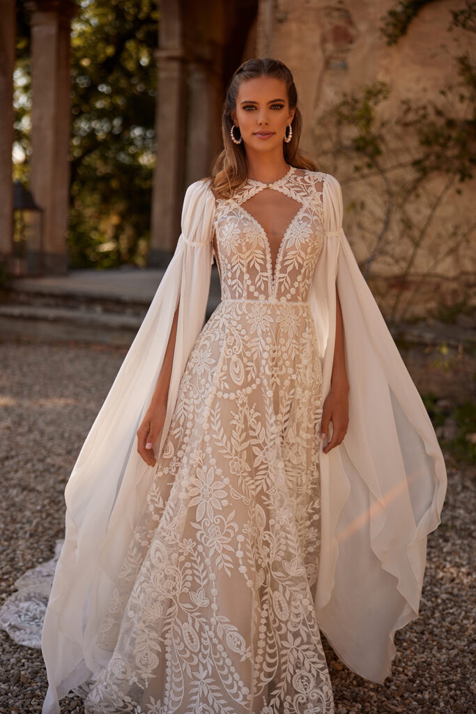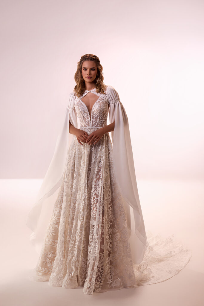 Natürlich. Dadurch, dass Boho-Kleider so leicht sind, werden kleinere Bräute nicht versteckt. Zu große Prinzessinnen oder Meerjungfrau-Kleider wirken oft unterproportional. Perfekt sind luftige A-Linien aus Chiffon oder Soft-Tüll, und genau daraus sind unsere Boho-Brautkleider.